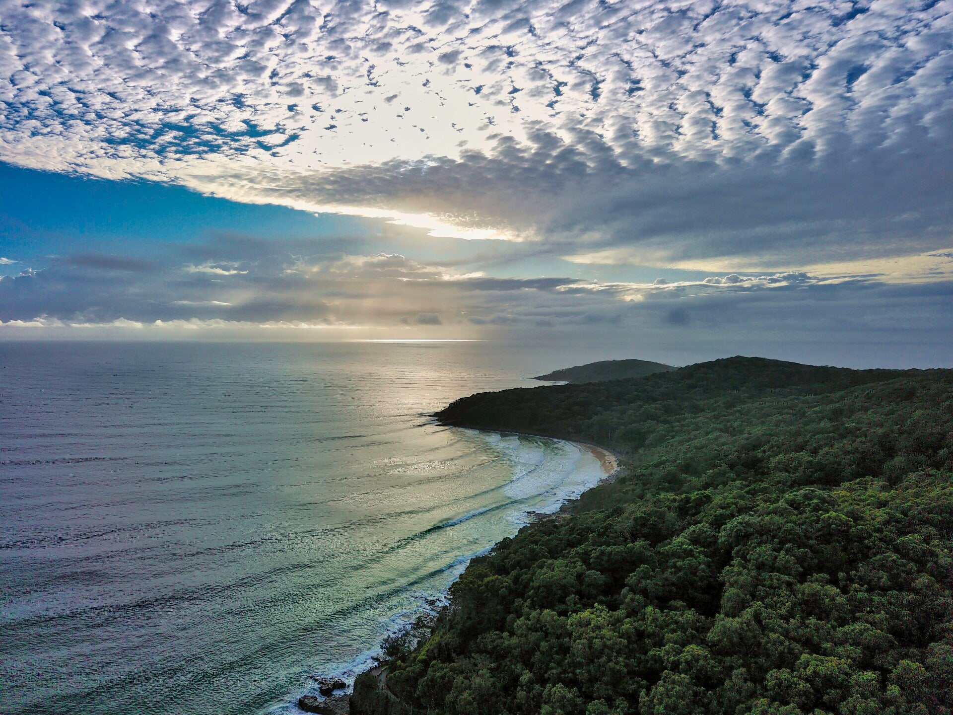 Dawn light spills over Noosa Head’s rugged cliffs as the sun rises behind swaying eucalypts.